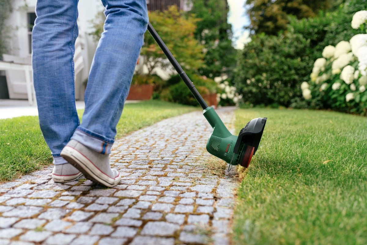 Geniet van comfortabel en gemakkelijk trimmen met de snoerloze Bosch EasyGrassCut 18V-230 grastrimmer. Uitgebalanceerd en licht zorgt deze voor gemakkelijk hanteren en snoerloze vrijheid om vrij rond te lopen. De EdgeSimple-functie in de bovenste handgreep maakt het wisselen van de trim- naar de kantsnijfunctie gemakkelijker door gewoon op de knop te drukken en het gereedschap naar de kantsnijfunctie te draaien. De semiautomatische spoel van het gereedschap voert de trimdraad bij elke druk op de schakelaar toe. Met een volledig opgeladen accu kan de grastrimmer de graskanten van maximaal zes tennisbanen in één ruk snijden.
