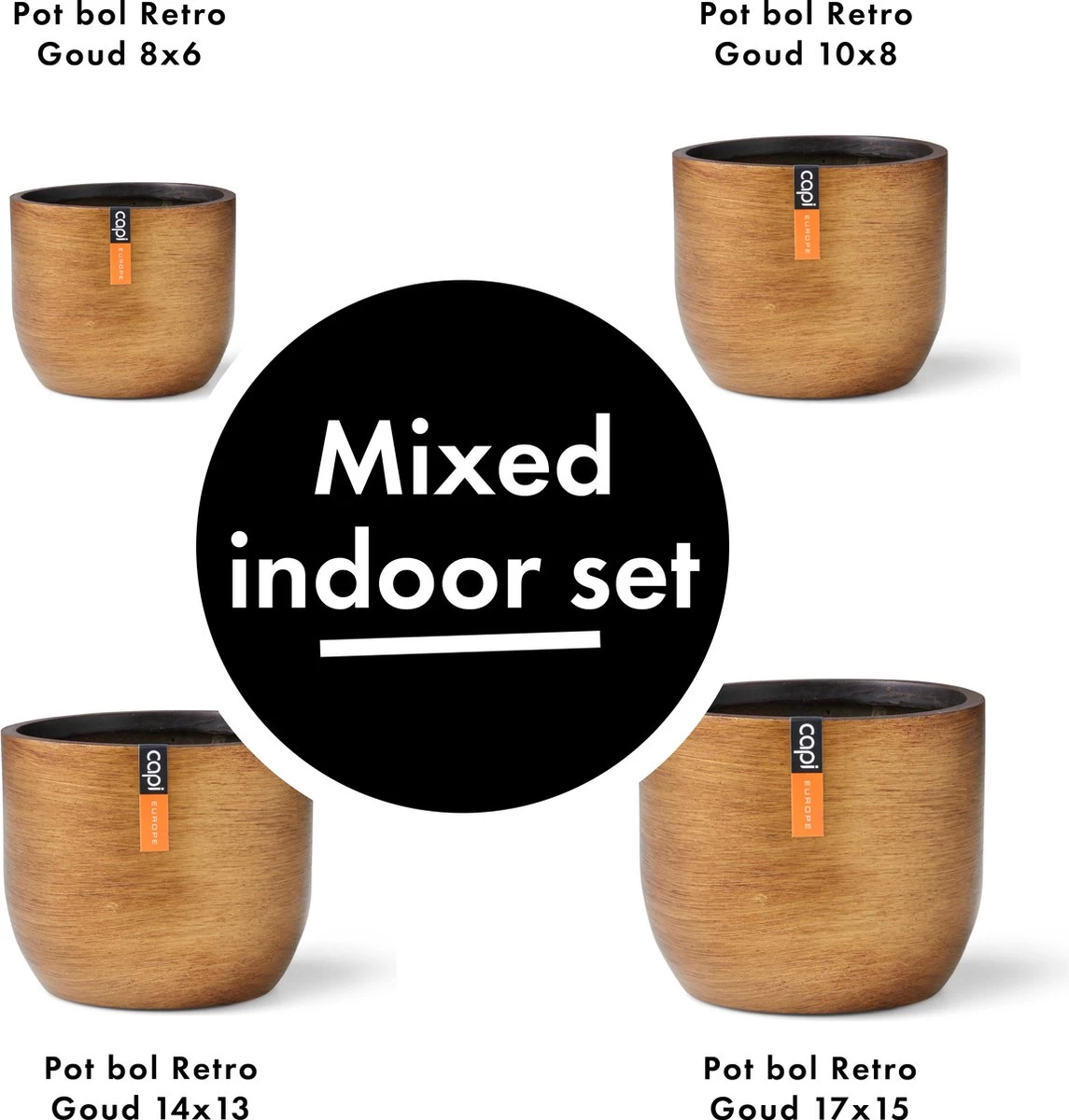 Deze set met goud bevat 4 gouden binnen plantenbakken uit onze Lux Retro goud collectie. De Lux Retro collectie heeft een retro uitstraling maar dan opnieuw uitgevonden. Goud en een strak design. De gouden bloempotten geven een mooie glans aan uw interieur.