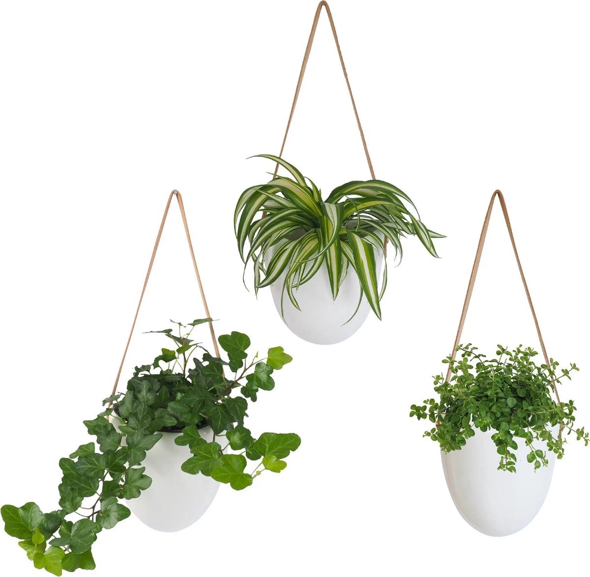 Gadgy Plantenhanger Keramiek – Set Van 3 – Hangpot Van Wit Steen – Hangende Bloempot Plantenpot – Met 3 Verschillende Koorden – 12x11x9.5CM