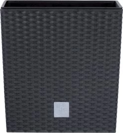 Kunststof Rato rotan bloempot/plantenpot antraciet 40 cm. Kras en stootvast met rotanvlechtwerk uitstraling. Inclusief uitneembare binnenpot/binnenbak, zonder afwateringsgaten. De bloempotten/plantenpotten zijn geschikt voor binnen en buiten gebruik. Afmetingen(LxBxH):40 x 40 x 41 cm. Inhoud: 37 liter inclusief binnenpot, 64 liter exclusief binnenpot.